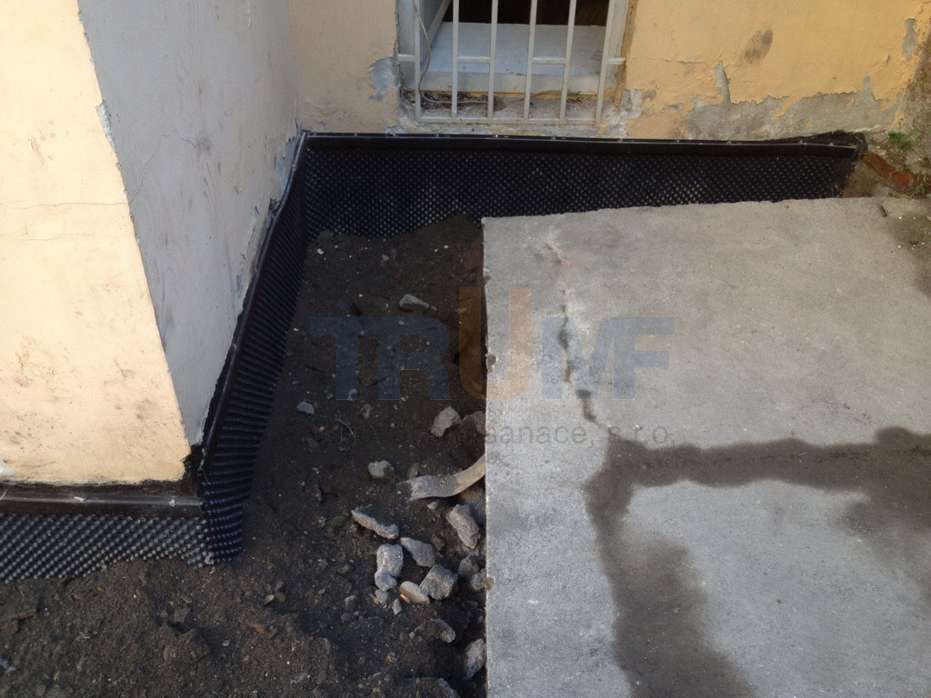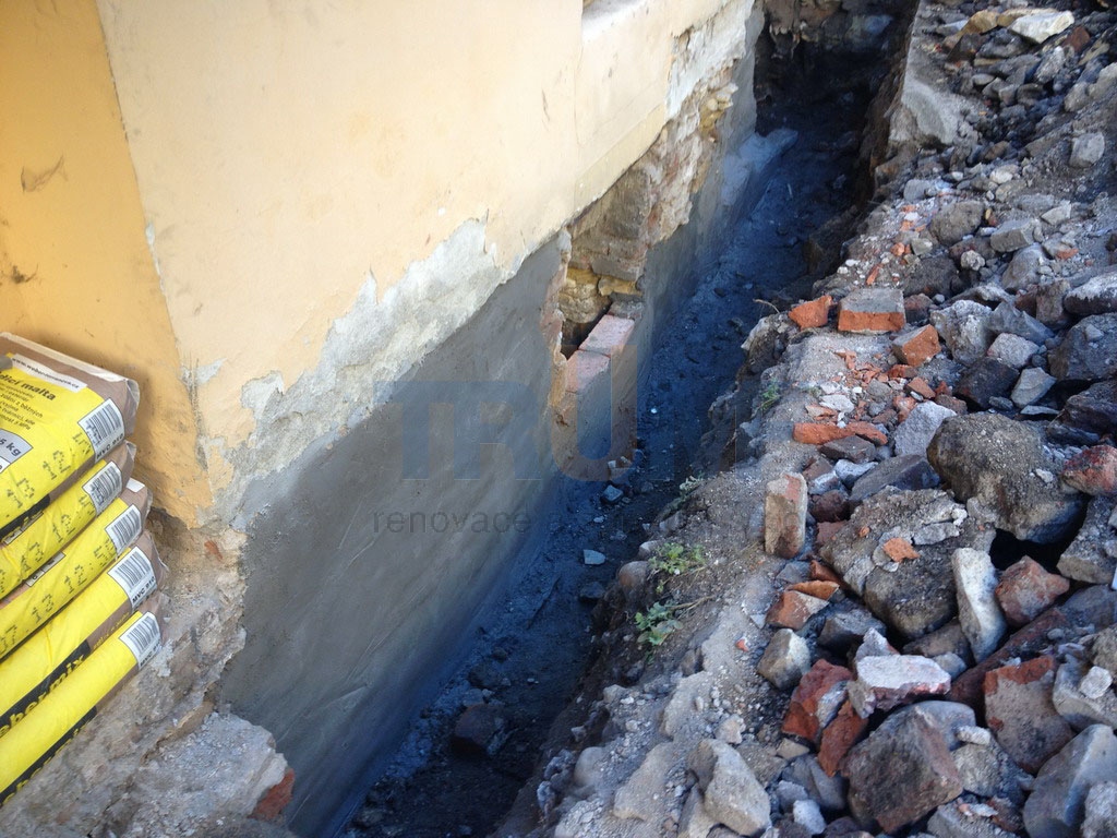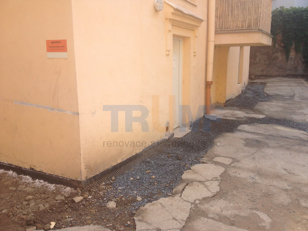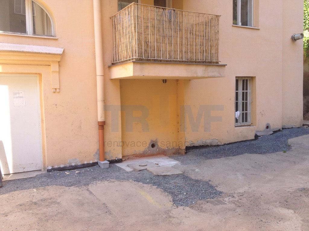 Jedná se o objekt v původním stavu, ve kterém chybí vodorovné i svislé izolace domu proti vlhkosti. Obvodové zdivo dvorního traktu je poškozováno rovněž ostřikující srážkovou vodou. Sklepní prostory nejsou majiteli využívány, tudíž nebyl kladený nárok na jejich odvlhčení. Předmětem řešení bylo provedení svislé izolace domu pod úroveň podlah nebytových prostor. Odkopáním byly odhaleny anglické dvorky v havarijním stavu a rovněž masivní poškození dešťového svodu včetně jeho napojení na kanalizaci. Rozpadající se obvodové zdivo bylo nahrazeno novými dozdívkami, následně jsme aplikovali hydroizolační stěrku s ochrannou nopovou fólií. Anglické dvorky jsme vyřešili provedením systému nových odvětrávacích průduchů. Svislá izolace domu proti vlhkosti byla doplněna vodorovnou izolací zdiva, kterou jsme provedli profesionální aplikací krémové injektáže zdiva.