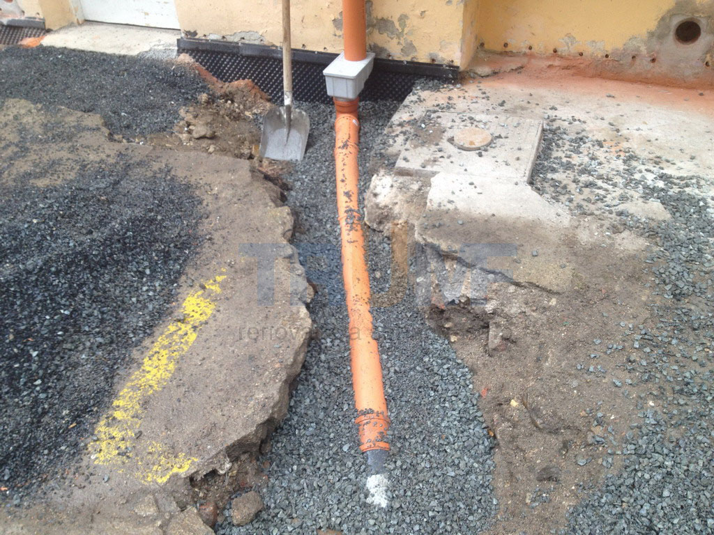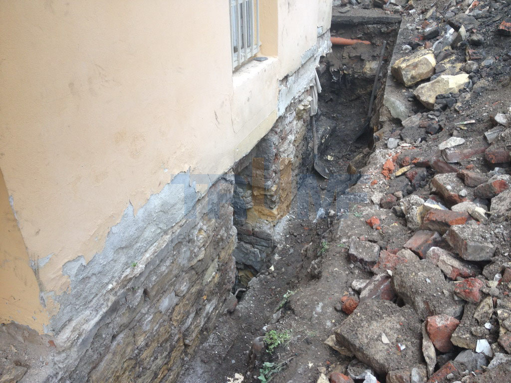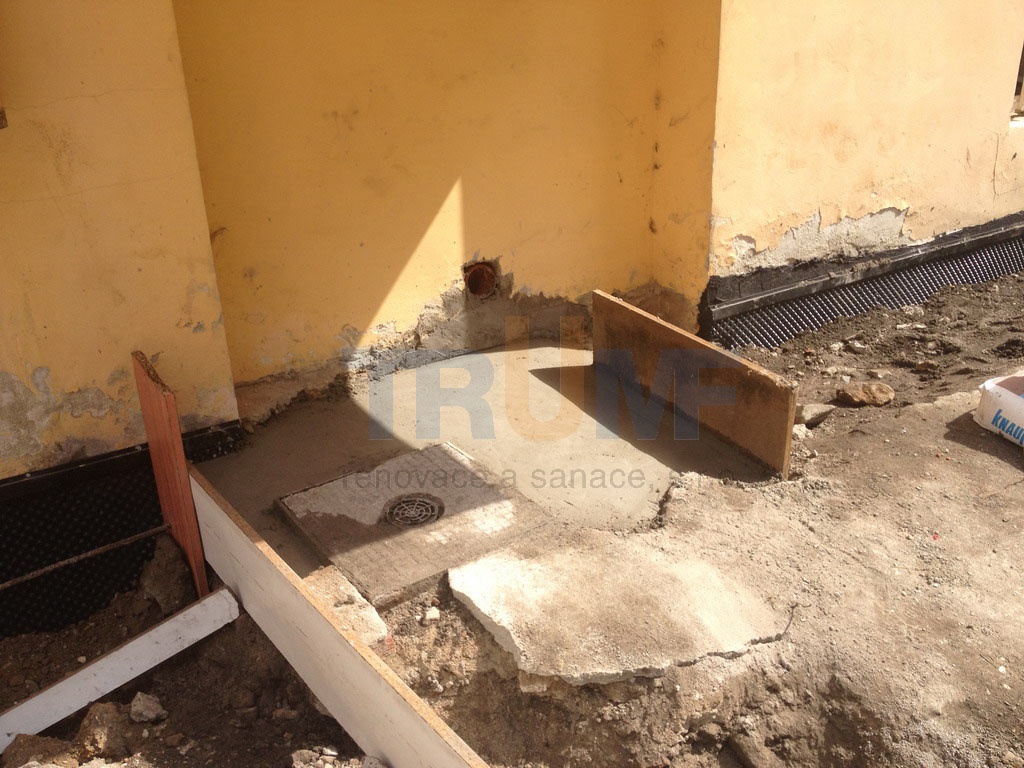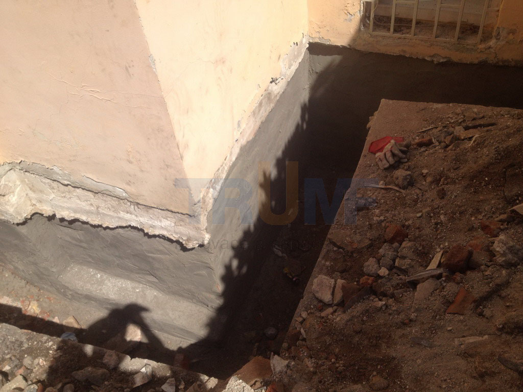 Jedná se o objekt v původním stavu, ve kterém chybí vodorovné i svislé izolace domu proti vlhkosti. Obvodové zdivo dvorního traktu je poškozováno rovněž ostřikující srážkovou vodou. Sklepní prostory nejsou majiteli využívány, tudíž nebyl kladený nárok na jejich odvlhčení. Předmětem řešení bylo provedení svislé izolace domu pod úroveň podlah nebytových prostor. Odkopáním byly odhaleny anglické dvorky v havarijním stavu a rovněž masivní poškození dešťového svodu včetně jeho napojení na kanalizaci. Rozpadající se obvodové zdivo bylo nahrazeno novými dozdívkami, následně jsme aplikovali hydroizolační stěrku s ochrannou nopovou fólií. Anglické dvorky jsme vyřešili provedením systému nových odvětrávacích průduchů. Svislá izolace domu proti vlhkosti byla doplněna vodorovnou izolací zdiva, kterou jsme provedli profesionální aplikací krémové injektáže zdiva.