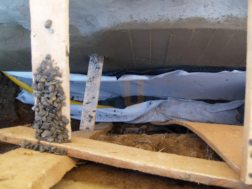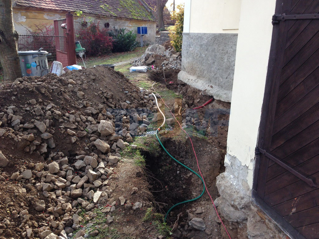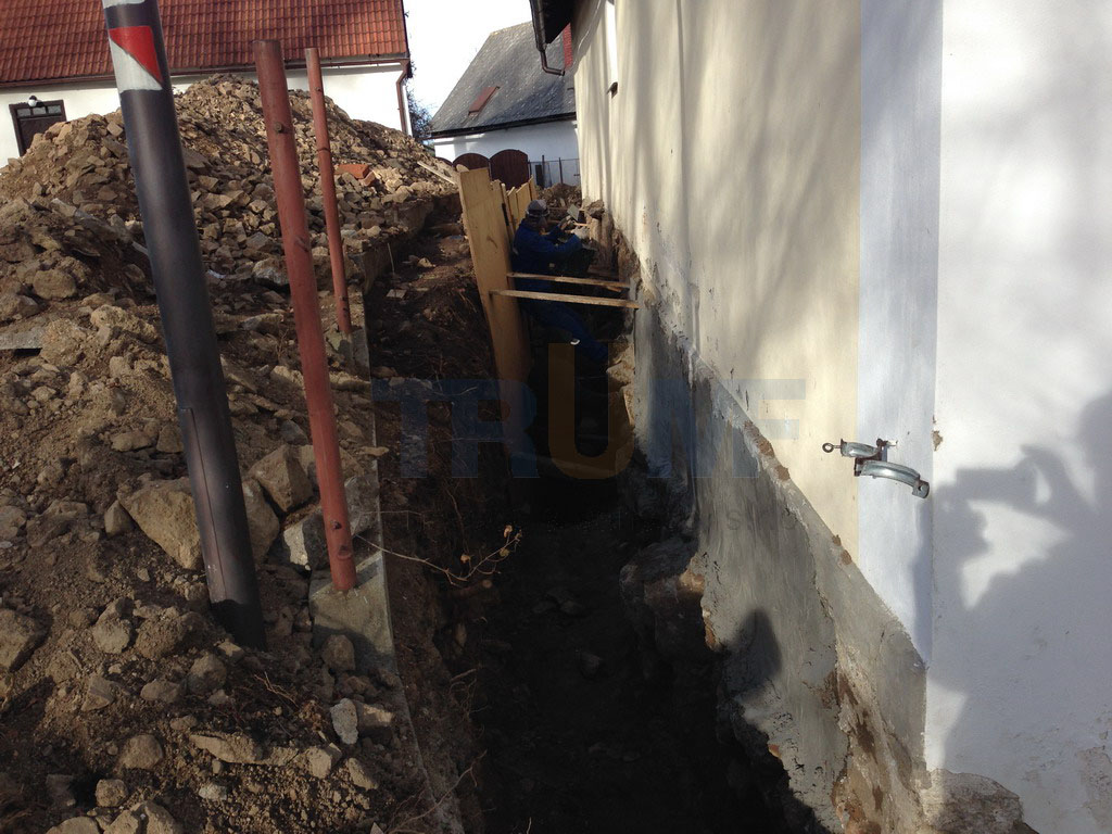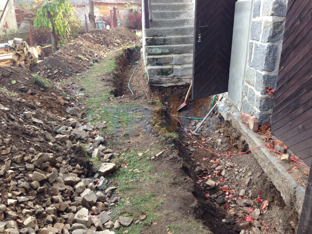 Nejprve bylo nutné odkopat obvodové zdivo až na základovou spáru. Pro urychlení prací jsme použili menší bagr. Základ domu byl tvořen nesoudržnými kamennými bloky, proto bylo nutné provést a zajistit zpevnění podterénního zdiva a rovněž i základů betonovou zálivkou. Teprve po vyzrání betonu jsme přistoupili k provedení vlastní hydroizolační stěrky. Finální vrstvu tvořil extrudovaný polystyrén pro zateplení zdiva a nopová fólie zajistila mechanickou ochranu celého systému.