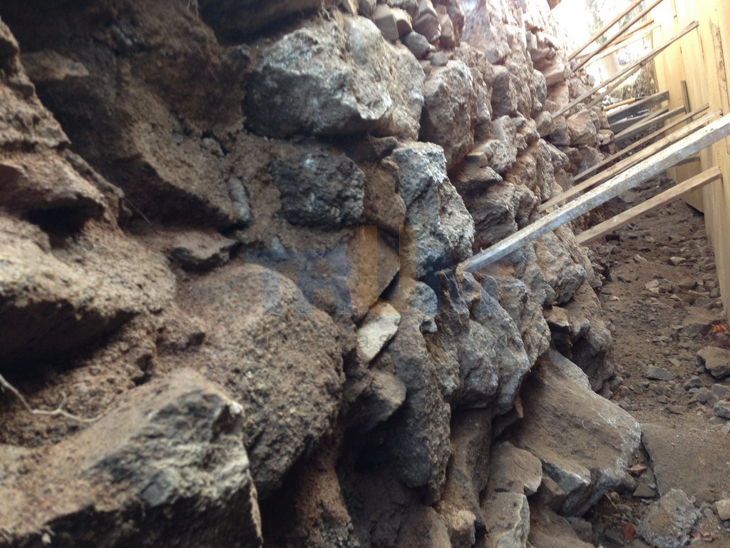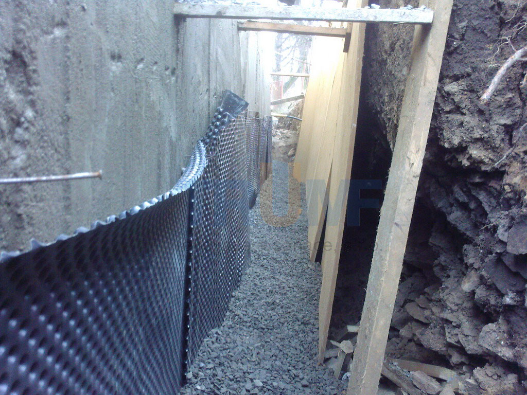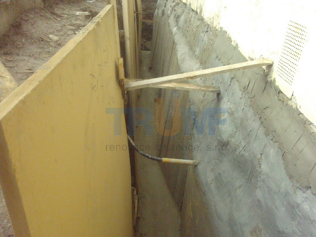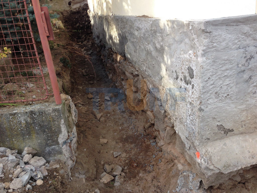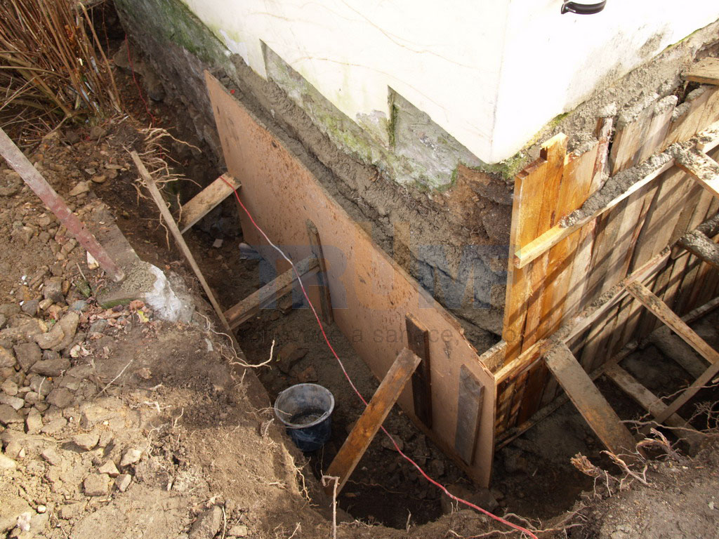 Nejprve bylo nutné odkopat obvodové zdivo až na základovou spáru. Pro urychlení prací jsme použili menší bagr. Základ domu byl tvořen nesoudržnými kamennými bloky, proto bylo nutné provést a zajistit zpevnění podterénního zdiva a rovněž i základů betonovou zálivkou. Teprve po vyzrání betonu jsme přistoupili k provedení vlastní hydroizolační stěrky. Finální vrstvu tvořil extrudovaný polystyrén pro zateplení zdiva a nopová fólie zajistila mechanickou ochranu celého systému.