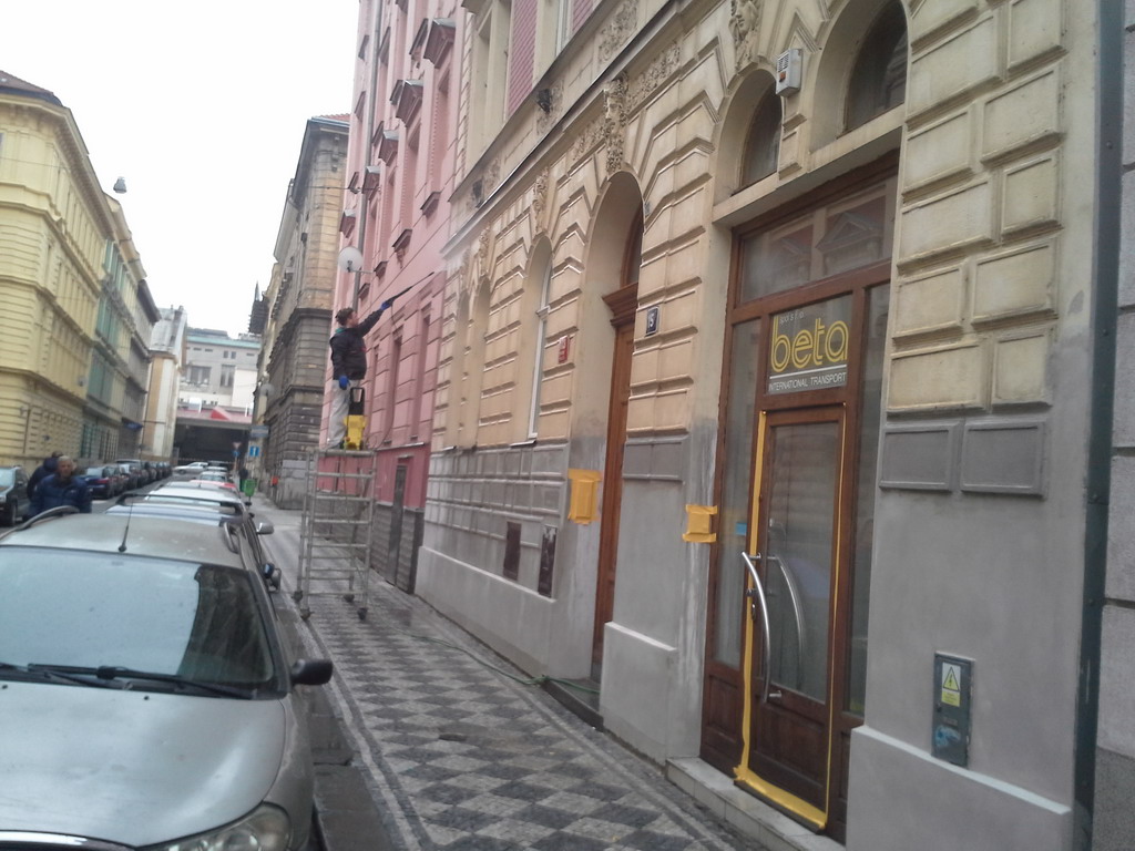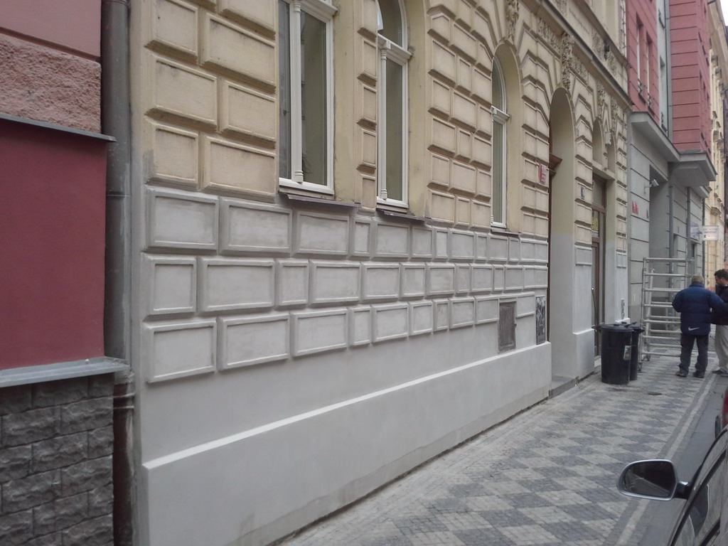 Nejvíce času zabrala samotná modelace jednotlivých bosáží. Bylo nutné vymodelovat přesně kopie původních prvků, aby nebyl patrný přechod mezi starou a opravenou částí fasády. Původním záměrem majitele domu byla pouze oprava omítky v nejhorších částech, nicméně v průběhu prací jsme se domluvili alespoň na omytí fasády tlakovou vodou a vyčištění od prachu a nečistot. Oprava staré omítky byla ukončena jemnou štukovou omítkou a silikátovou fasádní barvou. Bohužel nový nátěr je pouze na spodní části fasády, kde proběhla oprava poškozené omítky, nicméně i tak je výsledek velice dobrý.