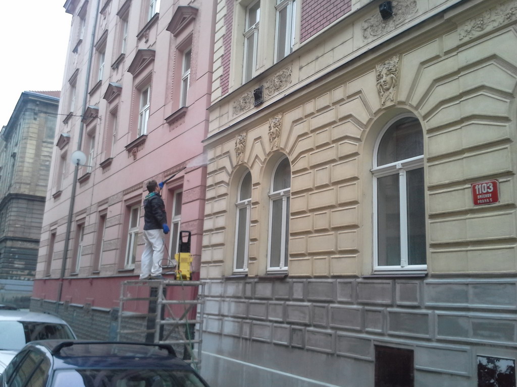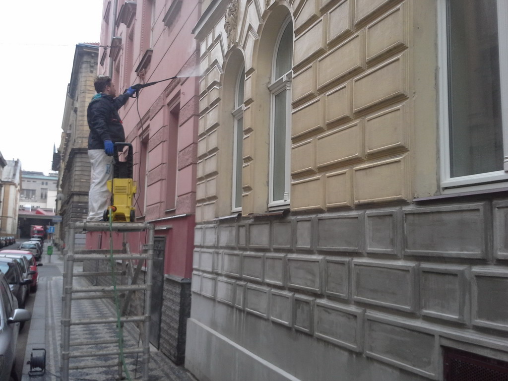 Z přiložených fotografií je vidět, že i omítka ve vyšších patrech není bezvadná, nicméně v porovnání s původním stavem spodních částí fasády, je v mnohem lepší kondici. Omytí fasády tlakovou vodou udělalo taktéž své. Prostor pro vylepšení a revitalizaci omítky zde jistě je a s přibývajícími roky bez údržby, kdy bude zdivo vystavené slunci, větru a dešti, bude tato potřeba více a více aktuální. Rádi se tak na místo vrátíme a omítce dáme nový život!