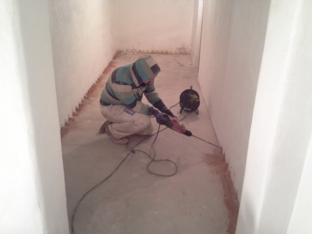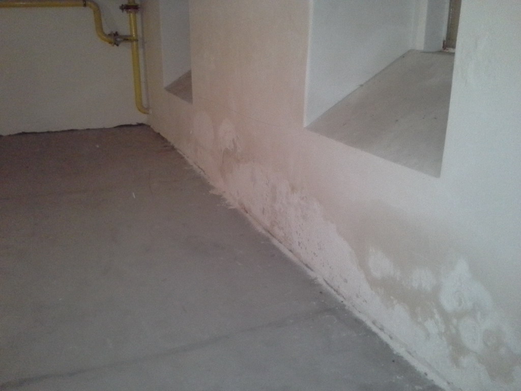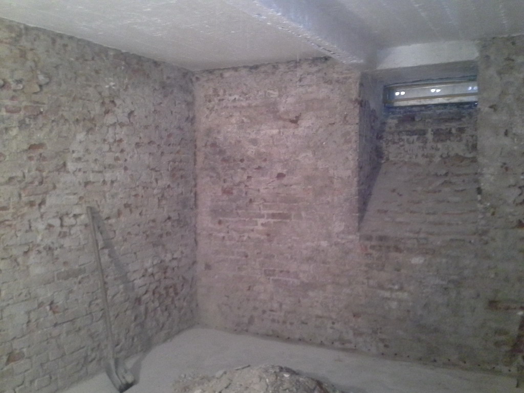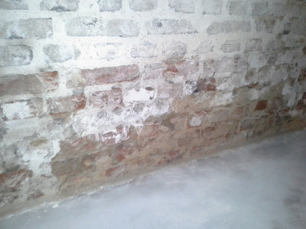 Poměrně nevhodným řešením bylo zalití podlah betonovým potěrem. Pod vrstvou betonu se totiž vlhkost hromadí a vzlíná do navazujících svislých konstrukcí. Tlaková injektáž zdiva sice vytvoří bariéru proti této vzlínající vlhkosti, ale chemická clona je neúměrně zatěžována a snižuje se její životnost. Betonové podlahy jsme tedy odstranili zcela nebo jen částečně podél obvodových zdí a nahradili je betonovou dlažbou usazenou do silné vrstvy štěrku. Toto řešení zajistí bezproblémové odvětrání zemní vlhkosti do prostoru, odkud je možné ji odstranit větráním. Tlaková injektáž zdiva se provedla na veškerém zdivu – vnitřním i obvodovém. Původní použité omítky byly obyčejné vápenocementové nikoli sanační. Bylo proto nutné jejich odstranění, aby po vyschnutí zdiva bylo možné aplikovat sanační omítku, která odolá náporu stavebních solí obsažených ve zdivu.
